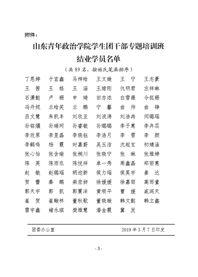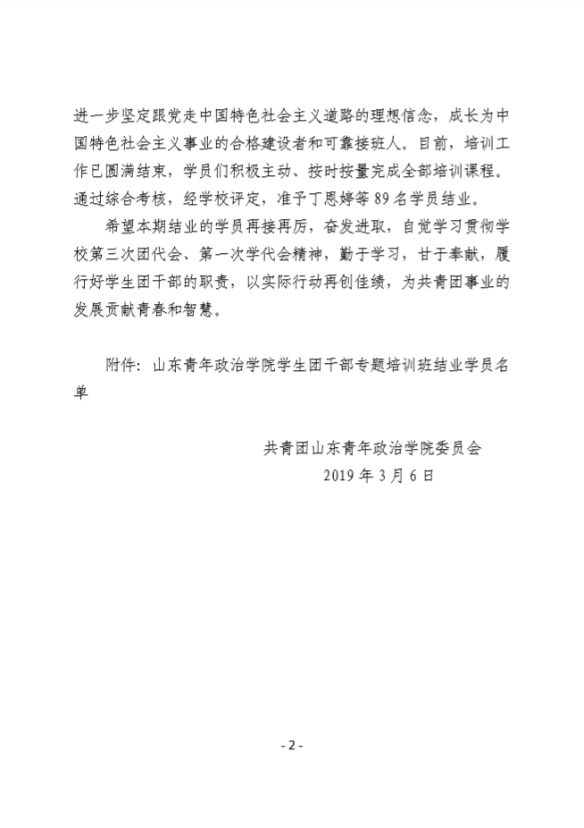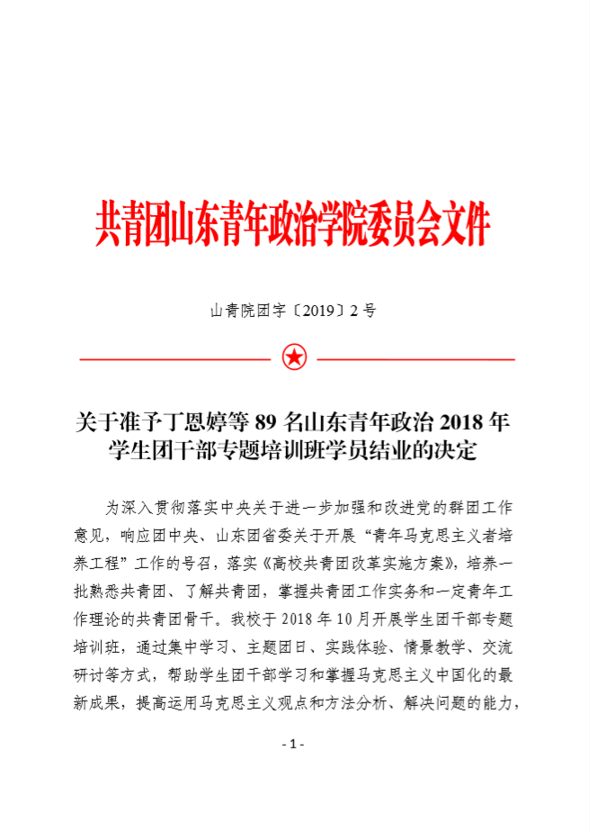 山青院团字〔2019〕2号关于准予丁恩婷等89名山东青年政治2018年学生团干部专题培训班学员结业的决定