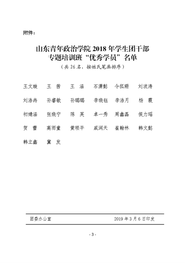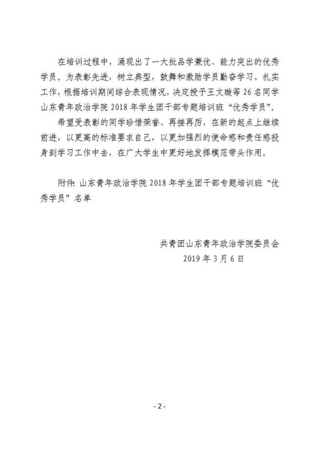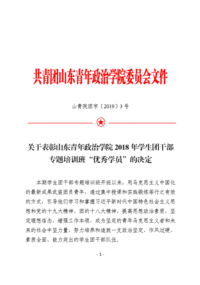 山青院团字〔2019〕3号关于表彰山东青年政治学院2018年学生团干部专题培训班“优秀学员”的决定