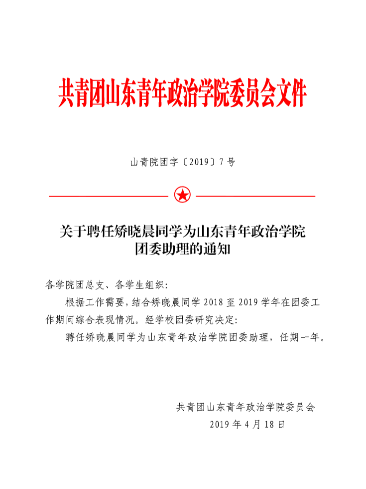 山青院团字〔2019〕7号关于聘任矫晓晨同学为山东青年政治学院团委助理的通知