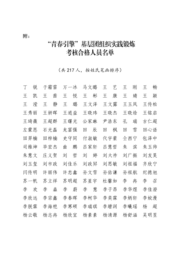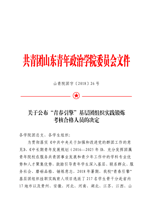 山青院团字(2018)26号--关于公布“青春引擎”基层团组织实践锻炼考核合格人员的决定