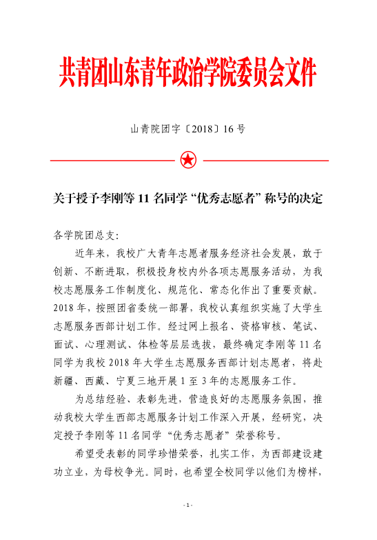 山青院团字〔2018〕16号--2018年西部计划志愿者表彰决定