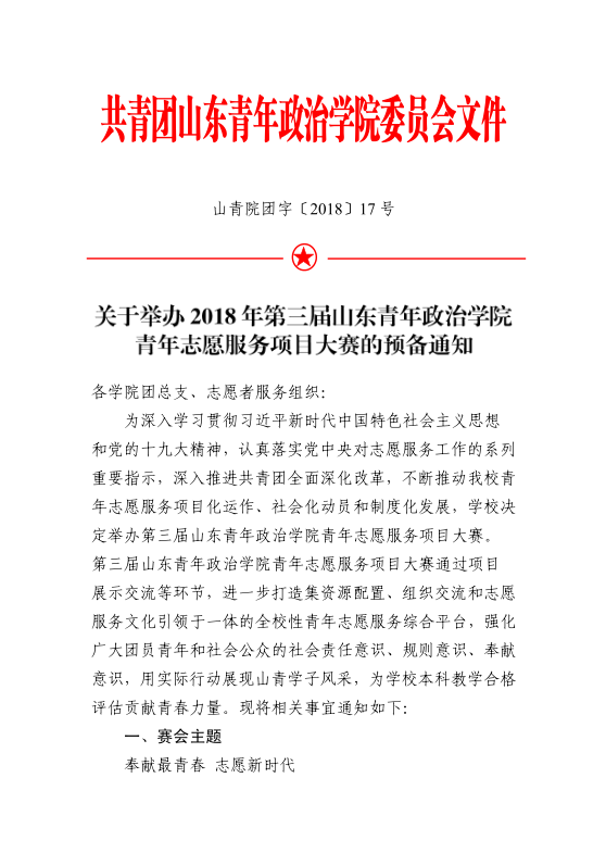 山青院团字(2018)17号--关于举办2018年第三届山东青年政治学院青年志愿服务项目大赛的预备通知