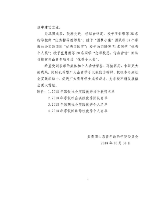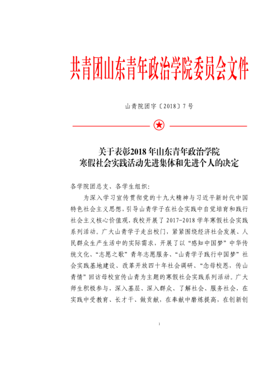 山青院团字〔2018〕7号--关于表彰2018年山东青年政治学院寒假社会实践活动先进集体和先进个人的决定