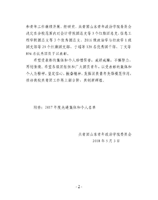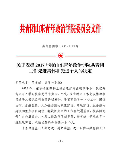 山青院团字〔2018〕13号--关于表彰2018年度山东青年政治学院共青团工作先进集体和先进个人的决定