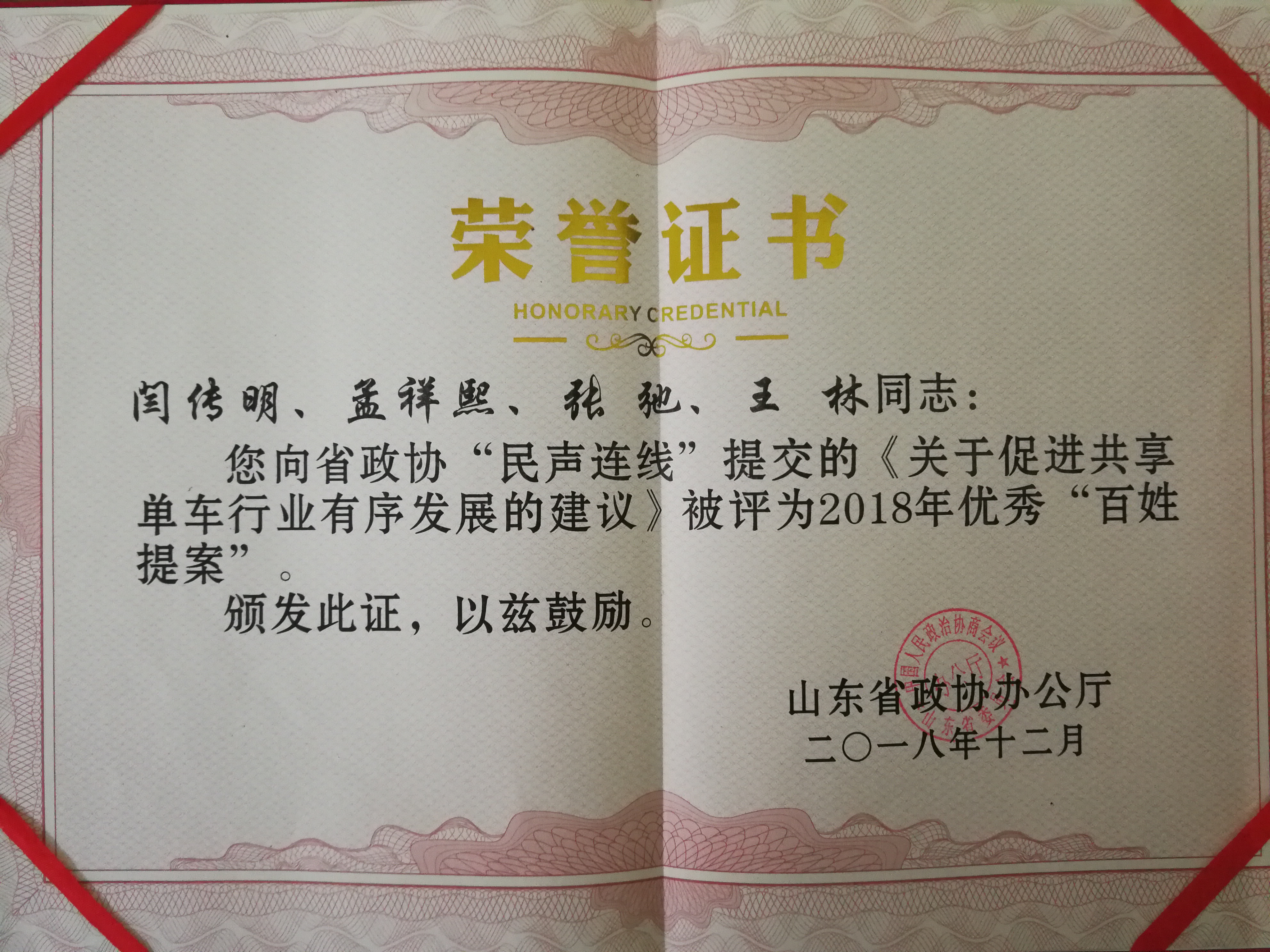 12月13日,山东省政协优秀“百姓提案”表彰暨十二届二次会议“民声连线”活动启动座谈会在山东省政协召开,省政协副主席兼秘书长王艺华同志出席会议并讲话。我校学生提交的《关于促进共享单车行业有序发展的建议》、《关于整顿建筑行业拖欠农民工工资现象的建议》两份提案经省政协、团省委专家审核,最终入选20个优秀提案受到省政协表彰,我校2016级政治与公共管理学院学生孟祥熙、2017级会计学院学生刘文政同全省其他行业部门11名群众代表受邀参加座谈,为山东省经济社会发展建良言献实策。