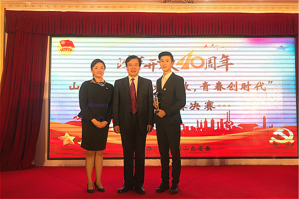 近日,由共青团山东省委主办的全省“思想大解放,青春创时代”演讲比赛决赛在济南军区第五招待所举行,团省委副书记李子元出席活动并为获奖者颁奖。我校文化传播学院2017级于特浩同学作为全省唯一一名入围决赛阶段的高校选手,荣获三等奖。