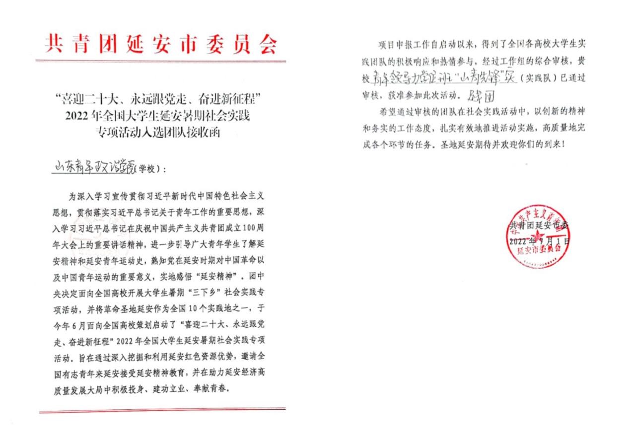 日前,共青团延安市委公布了2022年全国大学生延安暑期社会实践专项活动入选团队名单,我校青年领导力学位班“山青先锋”实践团成功获批“喜迎二十大、永远跟党走、奋进新征程”2022年全国大学生延安暑期社会实践。
