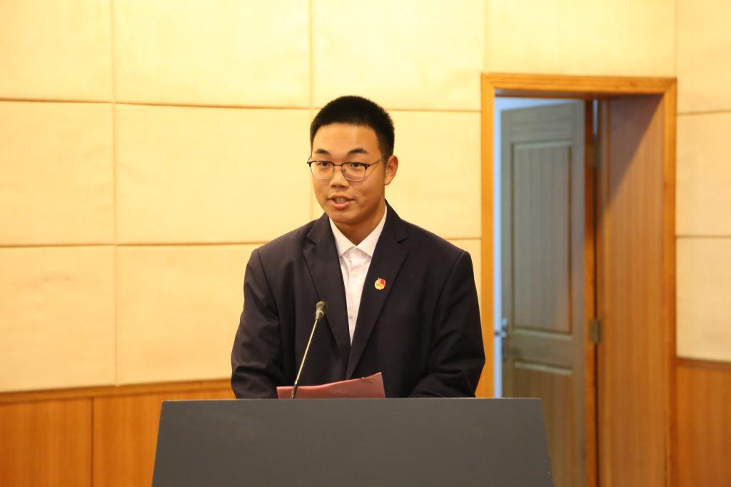 会议在庄严的国歌声中拉开序幕。校团委岳雨宣读新团员名单,并代表教师团干部向新发展团员表示祝贺。文化传播学院学生陈姗姗带领新团员面向团旗庄严宣誓。入团介绍人代表、现代服务管理学院学生边晓东宣读《中国共产主义青年团章程》中有关团员义务和权利的条例。经济管理学院学生孙忠旻作为优秀老团员代表发言,她呼吁大家自觉履行团员义务,苦练内功、练就本领,争做有志有为的优秀青年。现代服务管理学院学生郝文涵代表新发展团员作表态发言,她号召全体新团员坚定理想信念跟党走,努力学习科学文化知识,积极投身社会实践,带头参加志愿服务活动,将当代青年的正能量传递到全社会,用实际行动为团组织增光添彩。随后,教师团干部为新发展团员佩戴团徽,颁发了团章和团员证。