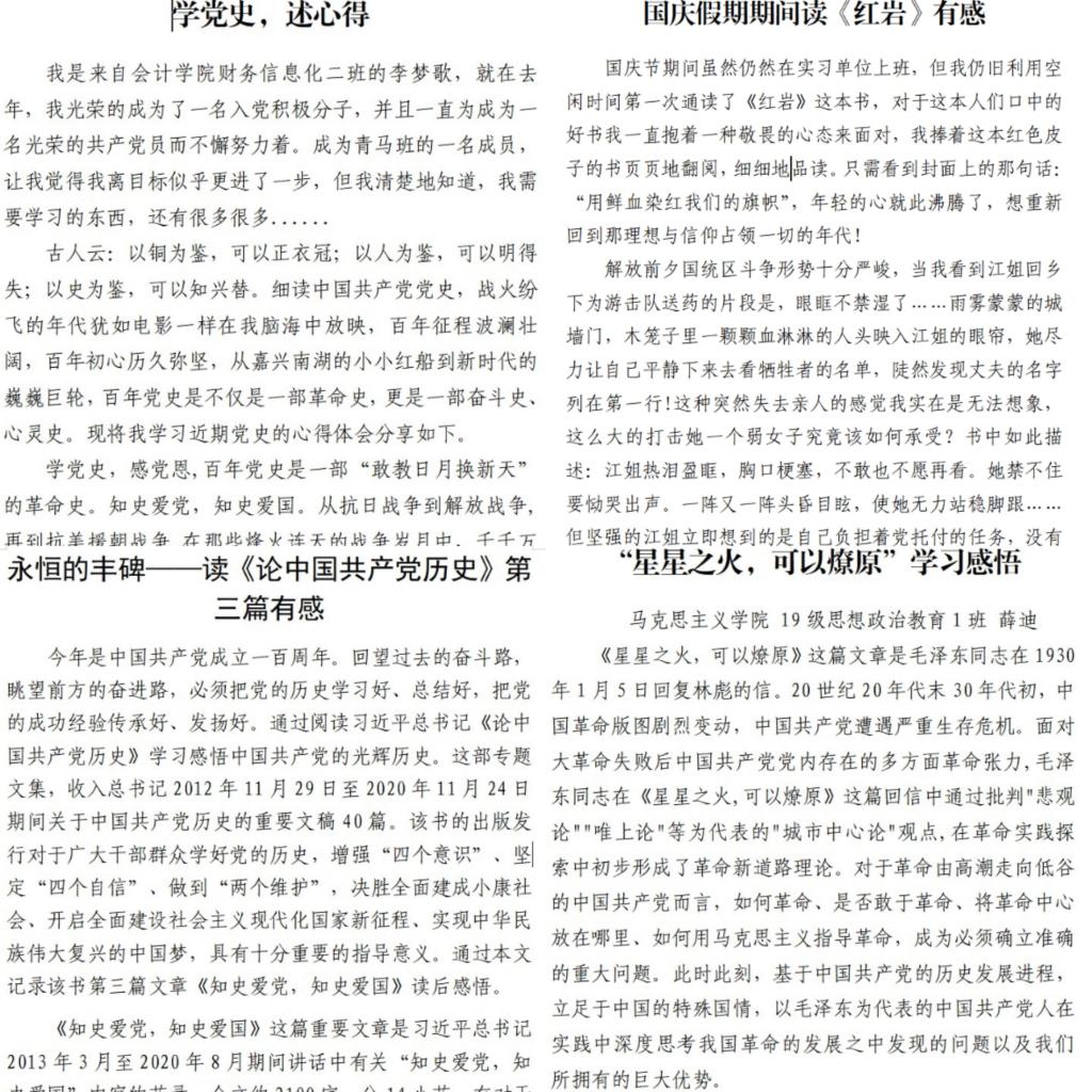 理论是行动的先导,思想是行动的指南。学百年党史,读经典著作,是一次接受精神洗礼的过程,更是一次与信仰的对话。国庆假期,青马班学员们深入阅读《论中国共产党历史》《长征》《星星之火,可以燎原》《红岩》等书目,提交读后感70余篇。青马班学员曹国庆记录到:我捧着这本红色皮子的书细细地品读,看到“用鲜血染红我们的旗帜”时,年轻的心就此沸腾,想重新回到那理想与信仰占领一切的年代!新时代传承的红岩精神,值得我们每一位大学生扪心自问,认真思考怎样去树立真正的信仰并为之奋斗!红岩,这面用鲜血染红的旗帜将永远在我心中飘扬,引我前行。