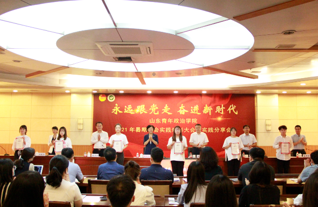表彰环节,高峰宣读关于表彰2021年山东青年政治学院暑期社会实践活动先进集体和先进个人的决定,38名社会实践指导教师获“优秀指导教师奖”; 38支团队获“优秀实践团队奖”;181名同学获“先进个人奖”,获奖代表先后上台领奖。