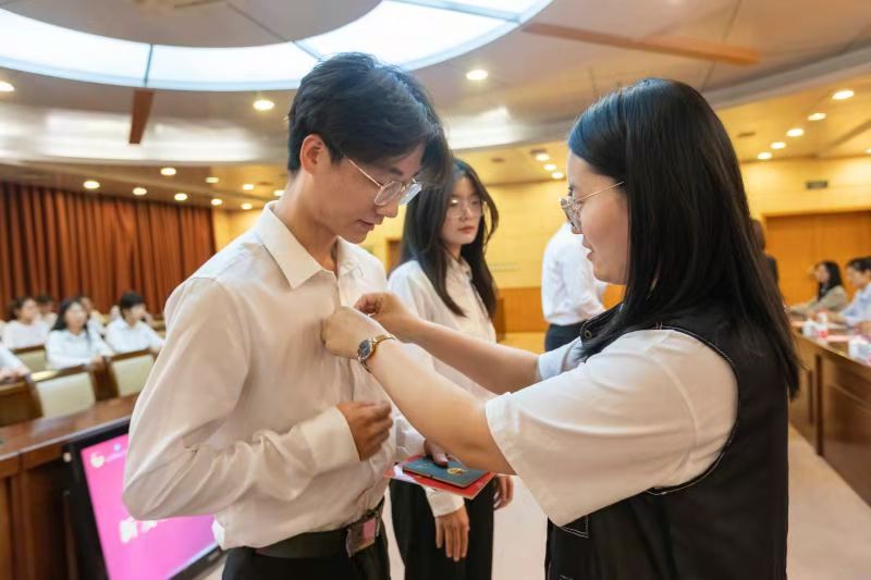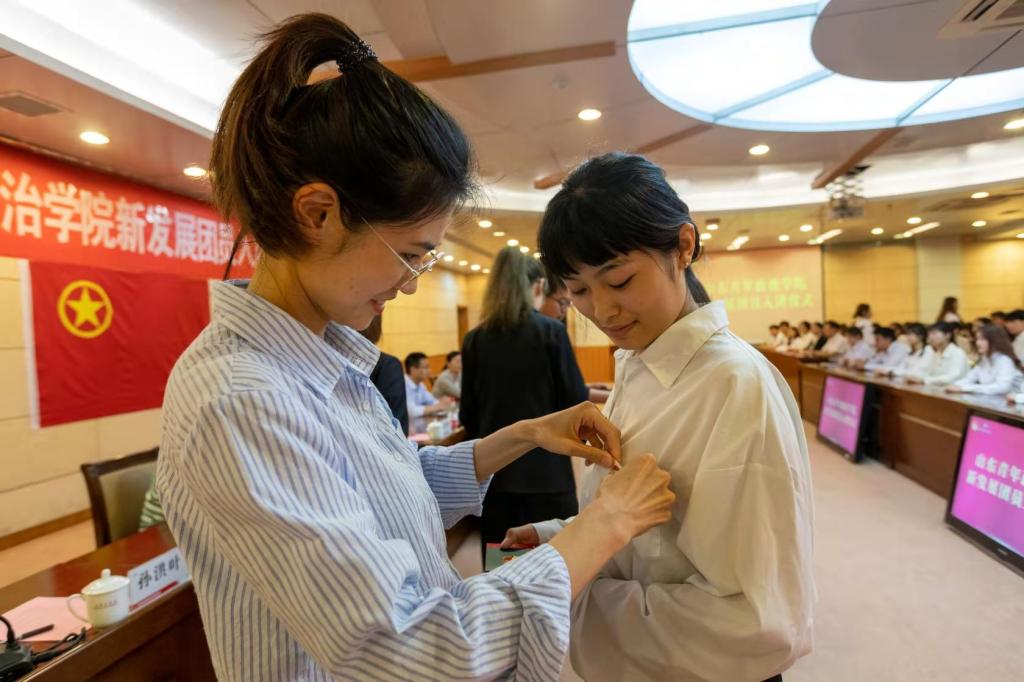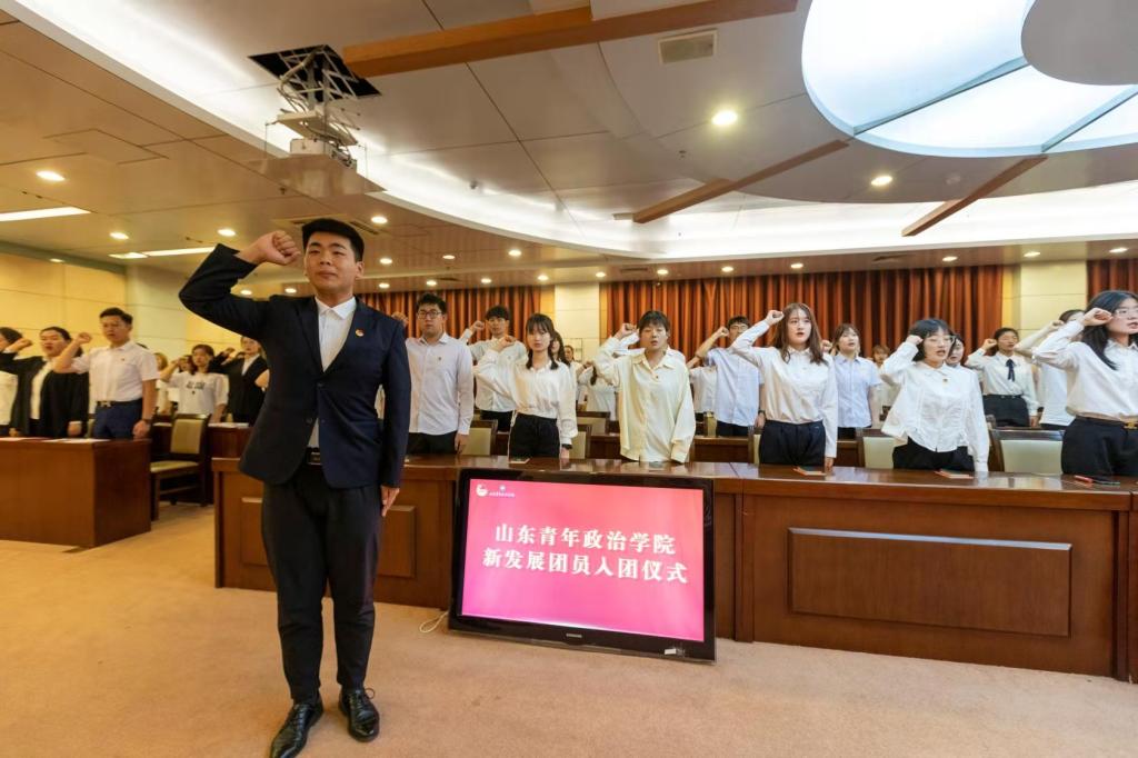 入团仪式上,孟祥佳以及各学院团总支书记、辅导员代表为新发展团员佩戴团徽并颁发团章、团员证。政治与公共管理学院2020级法律事务专业马伯泉带领全体团员青年一同重温入团誓词。入团介绍人代表、外国语学院2019级应用阿语专业马鑫昌宣读《团章》中有关团员义务和权利的条例。会计学院2018级审计专业董晓璇作为优秀老团员代表发言,她提醒同学们要时刻牢记自己作为一名共青团员的责任与使命,在团组织的领导下,找到人生真谛、生命价值和事业方向。外国语学院2019级西班牙语专业孔佳庆代表新发展团员作表态发言,她表示,新发展团员应当自觉听党话,跟党走,坚定理想信念,传承和弘扬红色基因,为广大青年学生做好表率与榜样。