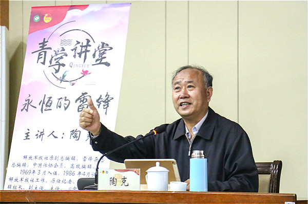 3月21日,由校团委与雷锋杂志社主办、外国语学院承办的青学讲堂——“永恒的雷锋”专题讲座在共青团文化中心举办。解放军报社原副总编辑、雷锋杂志总编辑陶克将军受邀担任讲课嘉宾,为山青师生呈现了一场特殊的思政课。雷锋杂志社副总编、原济南军区宣传部长张振江,雷锋杂志社通联办主任张培宽,高密市党员雷锋团党委书记、雷锋杂志常务理事单政达受邀做客,校党委副书记高峰、部分职能部门负责人、全体思政课教师、学团工作人员与300余名师生共同聆听报告。