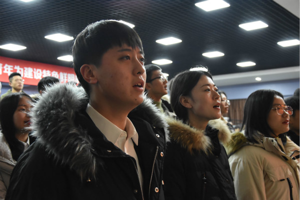 当天晚上,一场主题为“集结团旗下 争做新青年”的“特殊团课”在山东青年政治学院共青团文化中心举行,参加第三次团代会和第一次学代会的157名团代表、学生代表以青春的朝气、铿锵的话语表达着青年一代坚定的理想信念、不屈的奋斗精神。