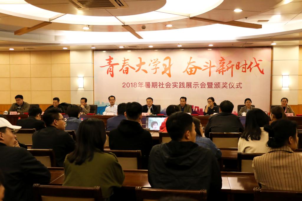 为贯彻习近平总书记对广大青年提出的“爱国、励志、求真、力行”要求,梳理、总结暑期实践育人工作。10月31日,我校2018年暑期社会实践总结展示会暨颁奖仪式在图书馆学术会议厅举行。学校党委副书记高峰,各部门、各学院相关负责人与各实践团队师生代表共聚一堂,分享收获与成长。百余名2018级新生代表进行了现场观摩。