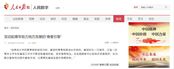 2.《人民网》(2018年8月7日):《发动起青年助力地方发展的“青春引擎”》