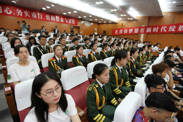 随后,学校第九届、第十届国旗护卫队的点名、交旗仪式将整场活动的气氛推向了高潮。整齐的步伐、标准的军礼、高亢的口号,更新换代的传承感和强烈的仪式感深深震撼了在场的每一位青年朋友。