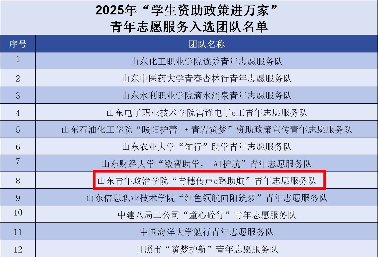 7月18日,共青团山东省委、山东省教育厅联合发布了2025年“学生资助政策进万家”青年志愿服务入选团队名单,我校文化传播学院“青穗传声 e路助航”青年志愿服务队凭借新颖的宣传形式和鲜明的宣讲特色脱颖而出,为学校的志愿服务事业增添了一抹亮丽的色彩。