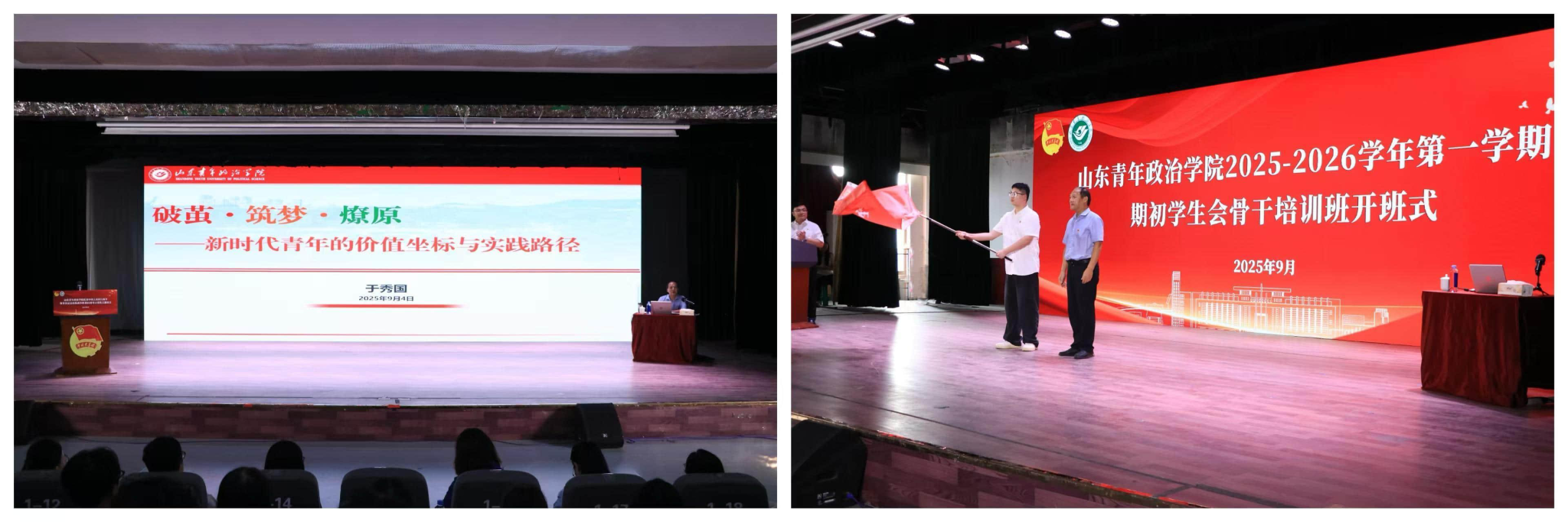 于秀国为培训班授旗并以《破茧 燎原 筑梦——新时代青年的价值坐标与实践路径》为题讲授专题党课。党课回溯了不同历史阶段青年与时代同频共振的壮丽篇章,深刻阐释了新时代青年应如何坚定理想信念、明确价值取向。他勉励大家,要将个人成长与家国命运、学校发展的深刻联结,要有“破茧”的闯劲、“筑梦”的韧劲、“燎原”的干劲,以“主人翁”“创业者”“传承者”的姿态,做学校迎评促建的生力军、申硕攻坚的贡献者、青年政治人才培养特色的代言人。