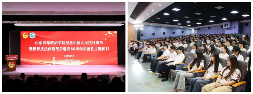 活动在激昂的团歌声中拉开帷幕。随后,全体与会人员集中观看了《铭记历史 缅怀先烈·抗日英雄谱》专题教育片,影片真实再现了抗战英烈奋勇抗争的光辉事迹,深刻激发了在场师生的爱国情怀与历史使命感。分享交流环节,学校2025年暑期“鲁韵烽火 青春接力”专项社会实践团队代表王华欣、校青马班学员代表屈超凡、校青马班班主任代表夏晓丽,分别从实践感悟、青年思考与育人引领三个角度,阐释了对抗战历史的深刻认识,表达了对革命先烈的崇高敬意与传承伟大精神的坚定信念,生动展现了山青师生矢志不渝、同心同向的精神风貌与责任担当。