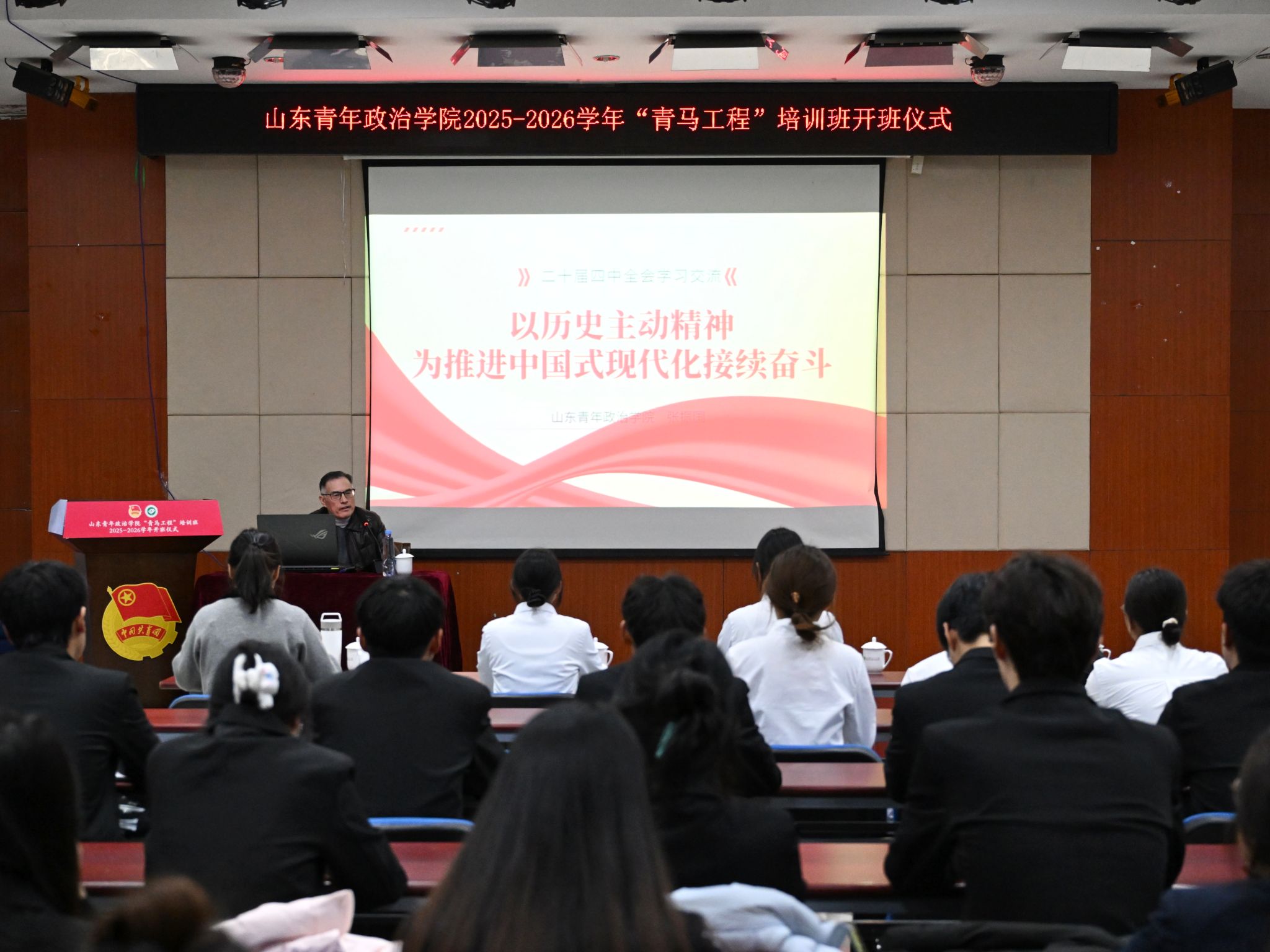 开班仪式后,“青马工程”培训班导师、马克思主义学院教授张振国以《以历史主动精神为推进中国式现代化接续奋斗》为题为学员们讲授了开班第一课。