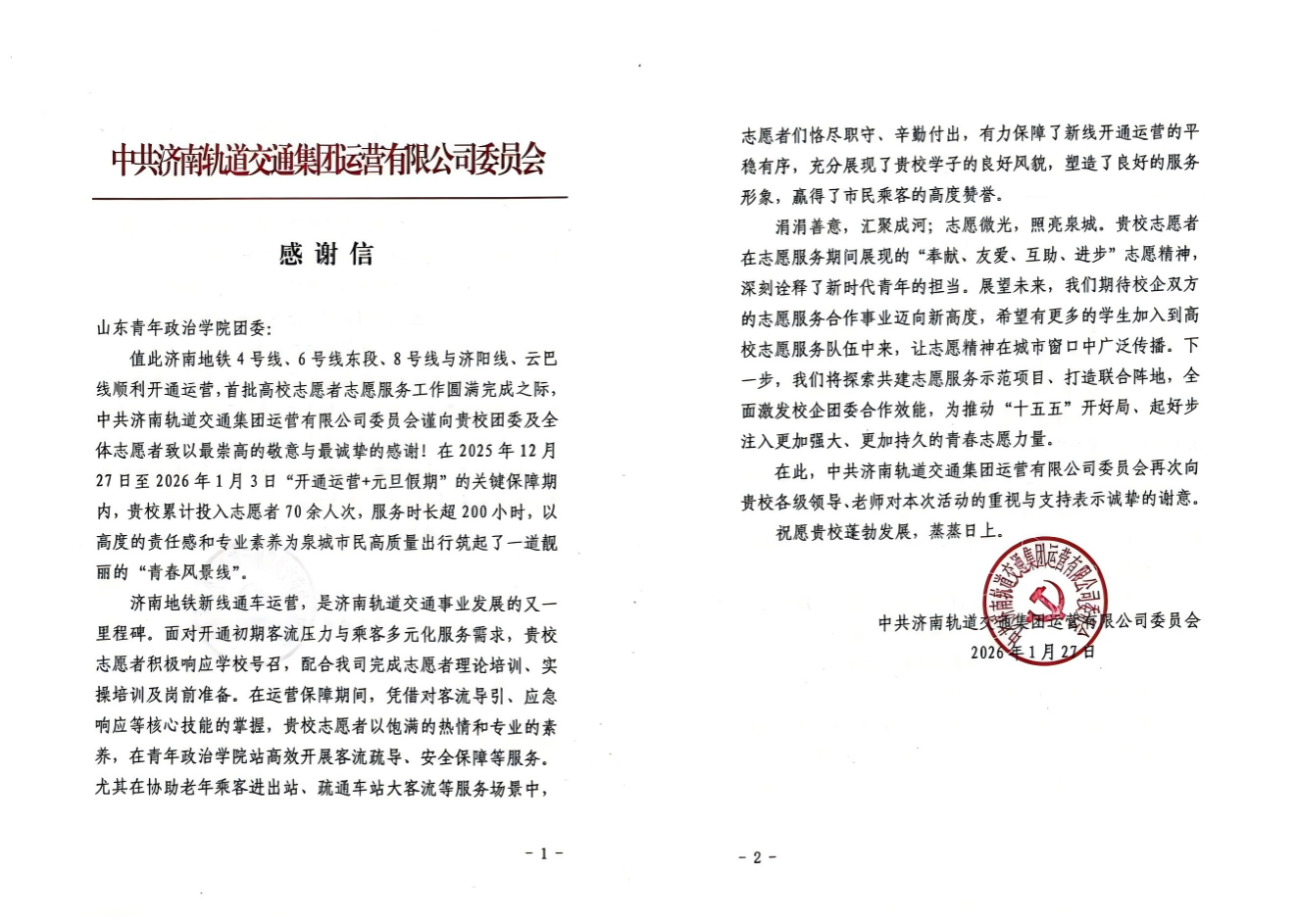 2月3日,济南轨道交通集团运营有限公司向学校发来感谢信,对我校志愿者在“8号线开通运营+元旦假期”叠加的关键保障期间所做的贡献给予高度赞扬。信中用情真挚,充分肯定了志愿者们在一线岗位上的辛勤付出与突出表现,并感谢学校主动担当、积极协同,为泉城市民高质量出行注入了强劲青春力量。
