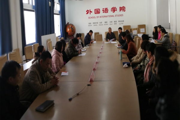 2月5日上午,外国语学院在会议室召开全体教职工大会,专题传达、学习学校第三次党代会精神,并就学习贯彻第三次党代会精神、决胜合格评估作出安排部署,外国语学院党总支书记李振杰主持会议。