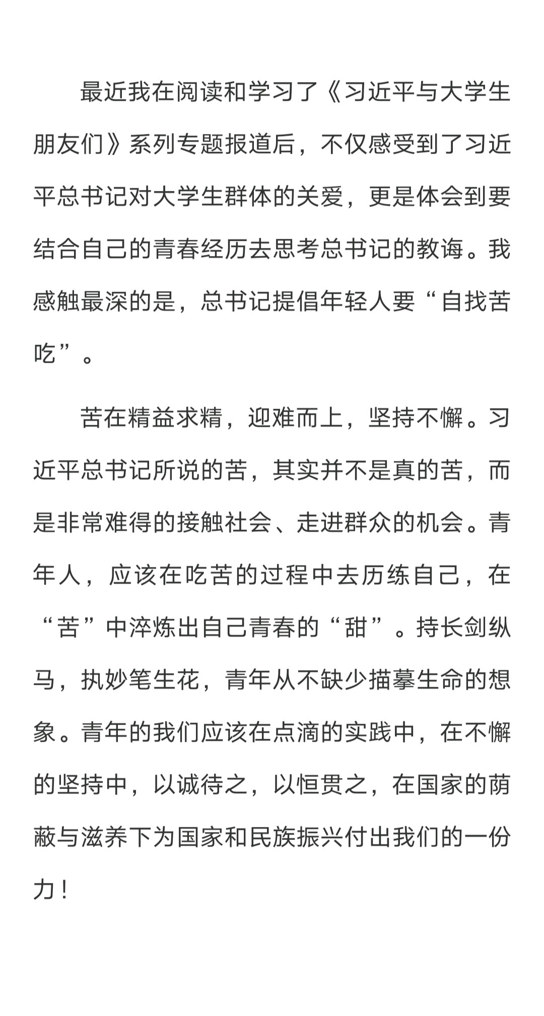 《习近平与大学生朋友们》记录了1983年来,总书记与大学生们交往交流交心,做青年朋友的知心人、青年工作的热心人、青年群众的引路人,对青年特别是大学生始终如一的关注关心关爱的一个个故事。学院积极组织阅读学习,利用中国青年报客户端开展专题答题活动,很快在全体学生中引起热烈反响。在书中记录着总书记与大学生们亲切交谈:谈对扶贫工作的认识,对基层工作的真切感悟,对深入调研实践锻炼的重视,希望大学生“自找苦吃”的殷切希望,无不启发着同学们拼搏奋斗,在校园、在基层、在社会探索成长,实践创新。2020级社会工作专业王凯表示,“我们要勇敢肩负起时代赋予的重任,志存高远,脚踏实地。努力学习专业知识,扎实练就个人本领,在祖国的万里长空放飞青春梦想!”
