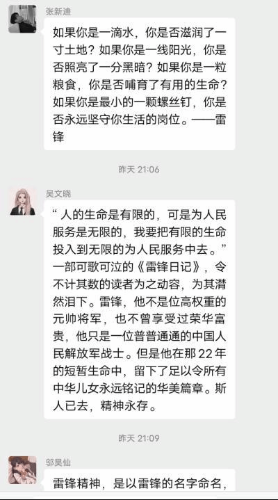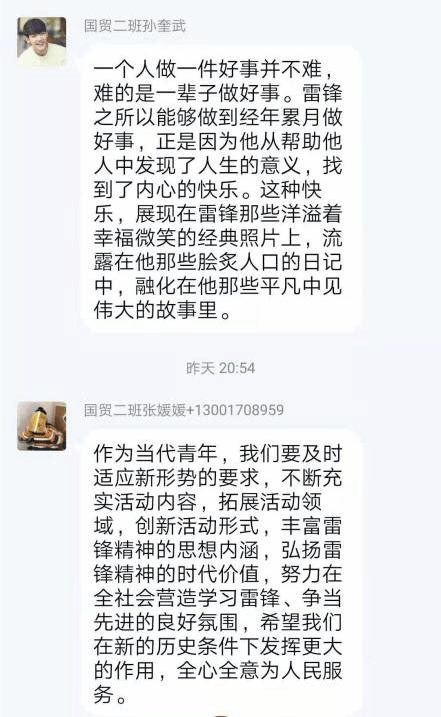 主题团日线上学,雷锋精神引共鸣。因为疫情,这个“学雷锋纪念日”与往常不同。各团支部纷纷利用线上平台,通过讲雷锋故事、学习雷锋日记、雷锋名言等方式,开展学习分享,引发了同学们的共鸣和感想。同学们纷纷在线上分享感悟,表示雷锋身上助人为乐、积极进取、勤俭节约的品质都是我们当代大学生不断学习的品质。2019级人力资源管理2班的刘田震同学分享到:雷锋精神体现了一种“向上”的人生姿态,体现了对新生活充满了无限热爱和美好向往,他始终以饱满的热情和充足的干劲投入到工作和学习中去,这是值得我们学习的。作为新时代大学生,更需要发扬雷锋精神,需要学习雷锋这种乐观向上、积极奋斗的人生态度。2020级国际经济与贸易(跨境电商方向)2班的谢骐蔚同学说到,我们学习雷锋精神就是要像雷锋那样,把有限的生命投入到无限的为人民服务中去,像雷锋那样发扬“钉子”精神,努力学习,用知识武装自己,提升自己,完善自己,为社会做出更大贡献。