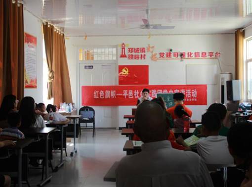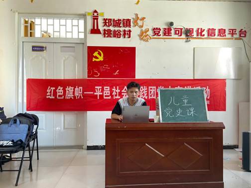 开展党史宣讲,践行初心使命。为更好地在实践中把学习成效转化为奉献国家、服务人民的实际行动。此次“红色旗帜”社会实践团走进郑城镇桃峪村,面向青少年儿童开展党史宣讲活动,通过党史宣讲,引导青少年厚植爱国情怀,发扬红色传统,传承红色基因。