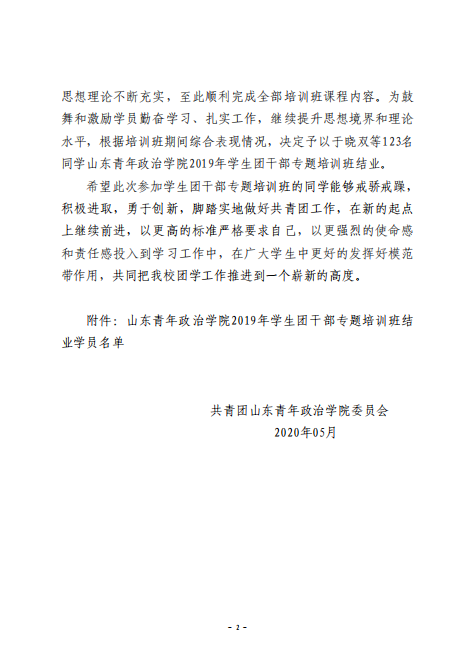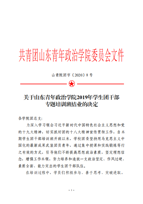 关于山东青年政治学院2019年学生团干部专题培训班结业的决定