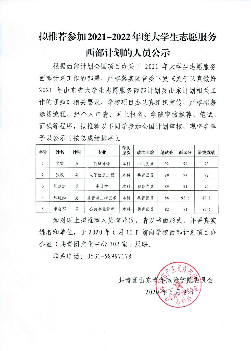 拟推荐参加2021-2022年度大学生志愿服务西部计划的人员公示