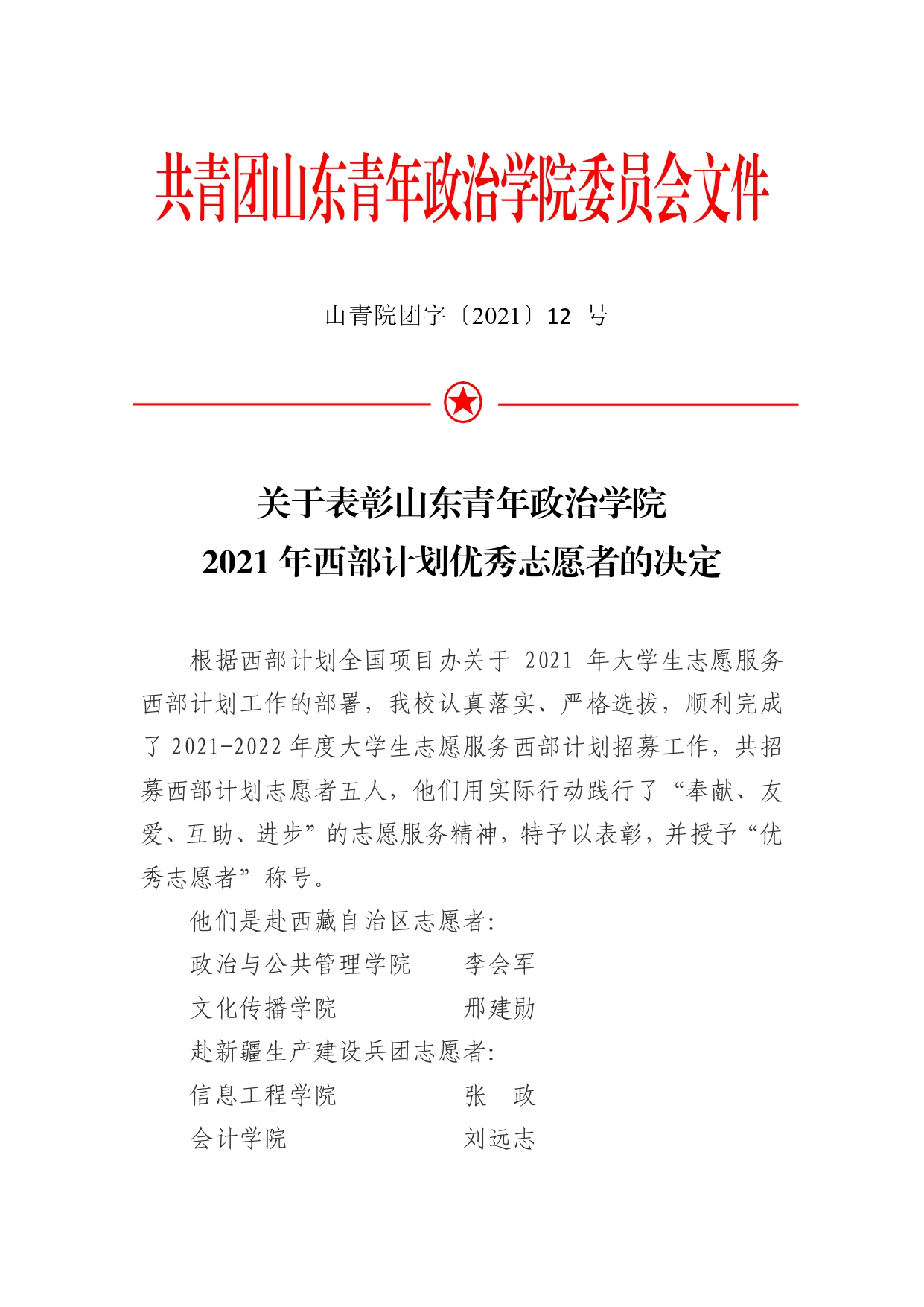 关于表彰山东青年政治学院2021年西部计划优秀志愿者的决定