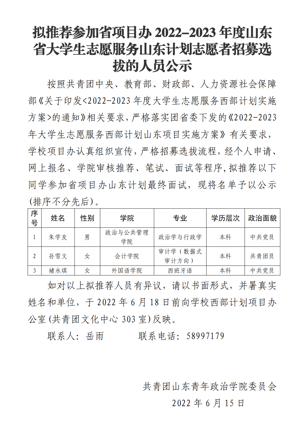 拟推荐参加省项目办2022-2023年度山东省大学生志愿服务山东计划志愿者招募选拔的人员公示