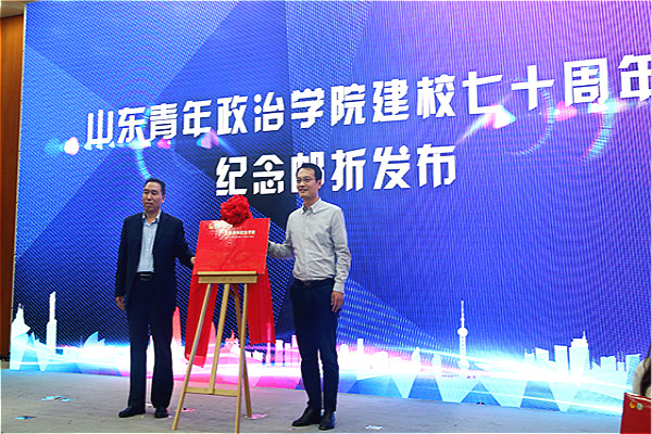 随后,党委宣传部部长杜秀与党委学生工作部部长蒋涛涛共同发布了由共青团山东青年政治学院委员会和学校教育发展基金会联合出品的《山东青年政治学院建校70周年纪念邮折》。