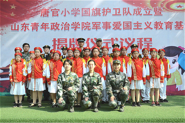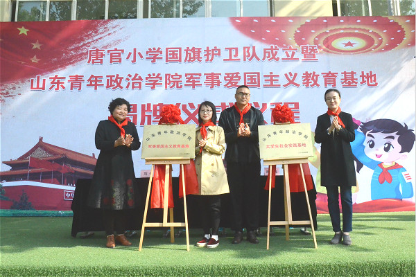 伴随着雄壮的国歌与冉冉升起的国旗,双方代表共同签署《国旗护卫队共建协议》,并为“山东青年政治学院军事爱国主义教育基地”“山东青年政治学院大学生社会实践基地”揭牌。随后,我校国旗护卫队为唐官小学国旗护卫队交旗授衔。随后,范红伟在致辞中表示,希望唐官小学的同学们要坚定爱国情怀,发扬国旗护卫队精神,做一名自强不息、追逐梦想的护旗手。宋爱芹高度肯定和赞扬了我校共青团工作取得的成绩,高度评价了国旗护卫队的精神面貌和志愿服务精神,表示将以此次共建工作为契机,进一步加强两校之间联系,深入加强青少年爱国主义教育,促进青少年健康成长、全面发展。