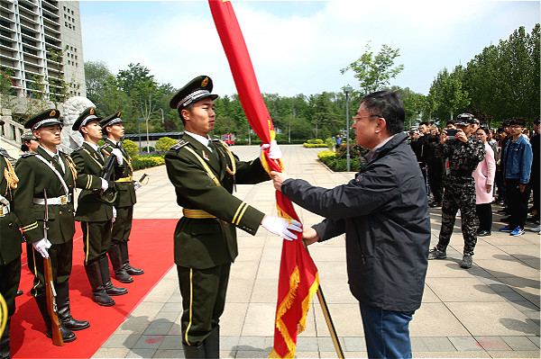 党委副书记高峰进行国旗交接,将国旗从第十届旗手手中接过,转交给第十一届旗手,并嘱托新一届国旗护卫队要不辱使命,不负重托,再创辉煌。随后,第十一届国旗护卫队以斗志昂扬的精神风貌、扎实严谨的作风纪律和成熟规范的队列进行了展示表演。