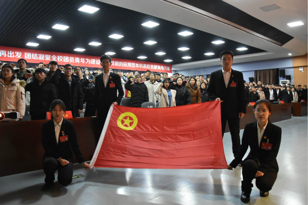 当天晚上,一场主题为“集结团旗下 争做新青年”的“特殊团课”在山东青年政治学院共青团文化中心举行,参加第三次团代会和第一次学代会的157名团代表、学生代表以青春的朝气、铿锵的话语表达着青年一代坚定的理想信念、不屈的奋斗精神。