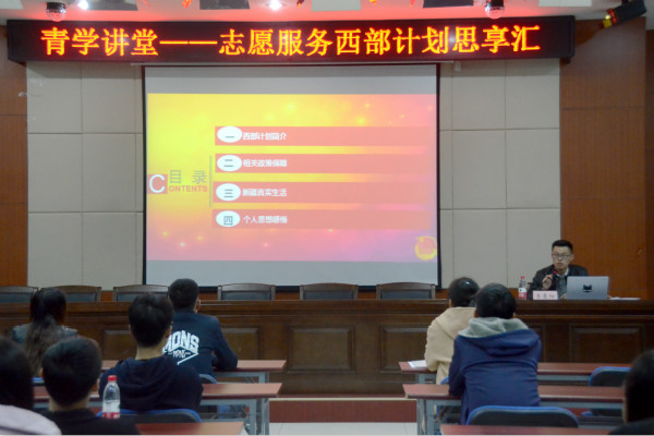 3月19日、29日,围绕本月共青团工作重点和“雷锋月”志愿服务主题,先后举办两期“青学讲堂”,邀请了2017届西部计划志愿者李晨阳、2017届山东计划志愿者杨彬、团省委志工部刘杰与广大团员青年作分享交流。