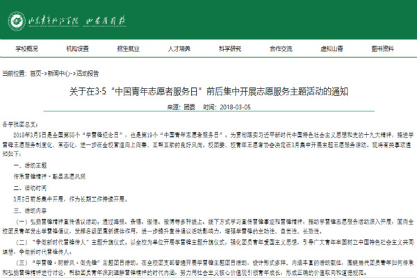 3月4日,校团委下发了《关于在3·5“中国青年志愿者服务日”前后集中开展志愿服务主题活动的通知》,号召全校各级团组织和广大团员青年以“传承雷锋精神·彰显志愿风采”为主题,集中开展弘扬雷锋精神宣传倡议活动和各类主题志愿服务活动。