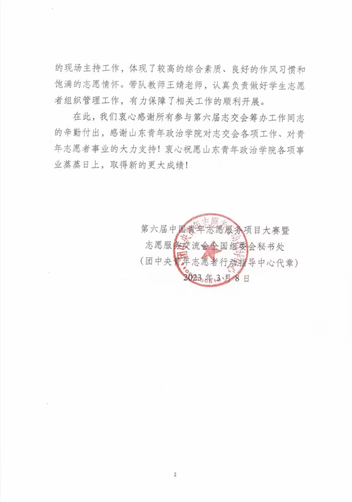 近日,共青团中央向学校发来感谢信,对我校对志交会和青年志愿者工作的大力支持表示感谢。信中表示:我校学生王岩、庄雯、焦毅晨、张明慧、魏明昊、李一硕,勇挑重担、认真负责,出色完成了第六届中国青年志愿服务项目大赛终评6组评审的现场主持工作,体现了较高的综合素质、良好的作风习惯和饱满的志愿服务情怀。带队老师王婧认真负责做好学生志愿者组织管理工作,有力保障了相关工作的顺利开展。