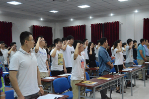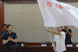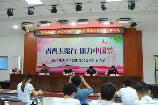 出征仪式上,团委副书记蒋涛涛对学校2017年大学生暑期社会实践进行了工作汇报,“青春引擎”基层团组织助力团负责人闫传明代表全体实践队员作了表态发言,“国旗下的牵手”共青团、少先队国旗护卫队共建行动负责人王怀强带领全体实践团队负责人进行了宣誓。